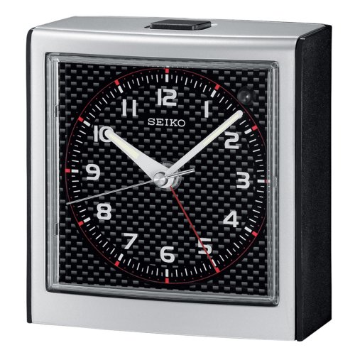 The Seiko Bedside Alarm Clock features an easy-to-read light-up dial for accurate timekeeping day or night. Constructed with a silver-tone metallic case, this compact bedside clock offers a large patterned black dial with white Arabic hour markers, slim white minute indexes, and a quiet-sweep second hand that won't disturb your rest. Other handy features of the clock include a dial light, luminous hands, and convenient volume control. This handsome clock's wake-up call features an ascending beep alarm with snooze option. Read more...