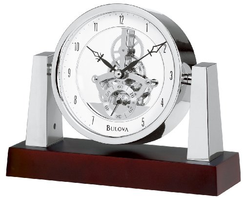 Largo-Dark wood base with mahogany finish and chrome finish pivoting clock housing and supports. Skeleton movement with seconds sub-dial, protective glass lens. 6"H x 7.5"W x 2.5"D. Read more...